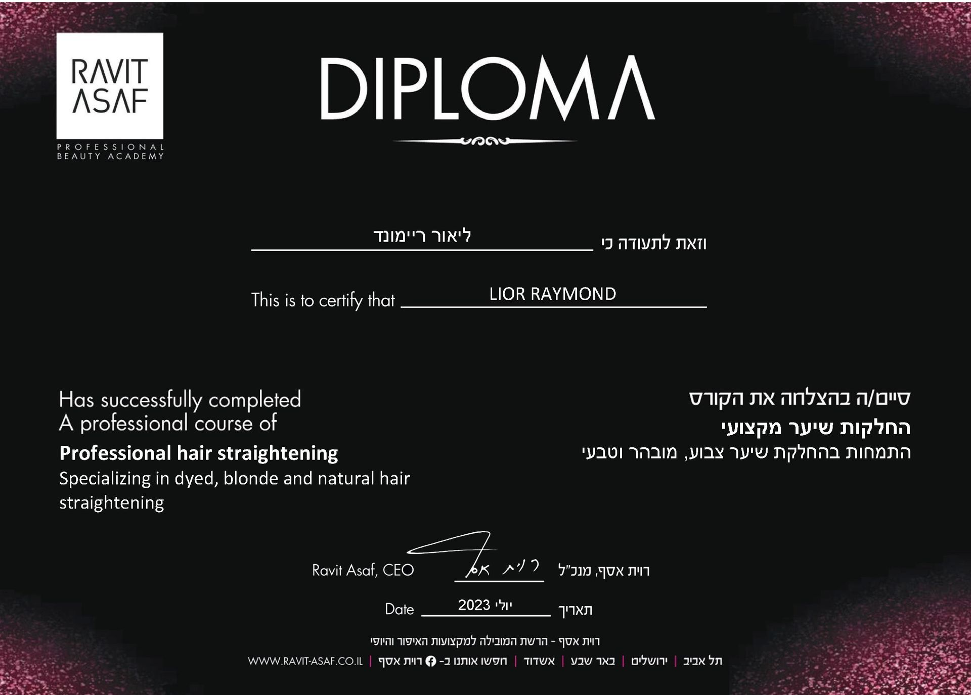 אני בוגרת בית הספר למקצועות היופי – רוית אסף עם התמחות בהחלקות שיער.